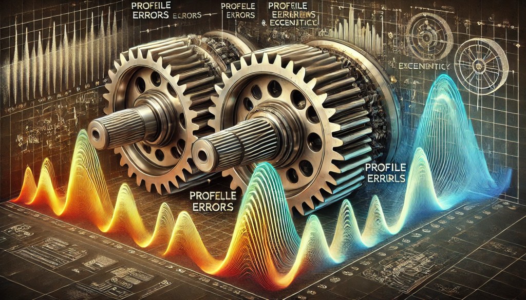- MTE (Manufactured transmission error): Questi errori derivano da imperfezioni nella fabbricazione degli ingranaggi, come errori di profilo, di passo, di eccentricità e, in misura minore di elica. Anche con le tecnologie più avanzate, è praticamente impossibile ottenere ingranaggi completamente privi di difetti. Per identificare gli MTE si utilizzano strumenti di precisione come l’evolventimetro o l’ingranometro. Questi errori non solo compromettono l’efficienza meccanica, ma possono causare un aumento significativo della rumorosità: studi dimostrano che un raddoppio degli MTE può incrementare il rumore di 6-8 decibel.