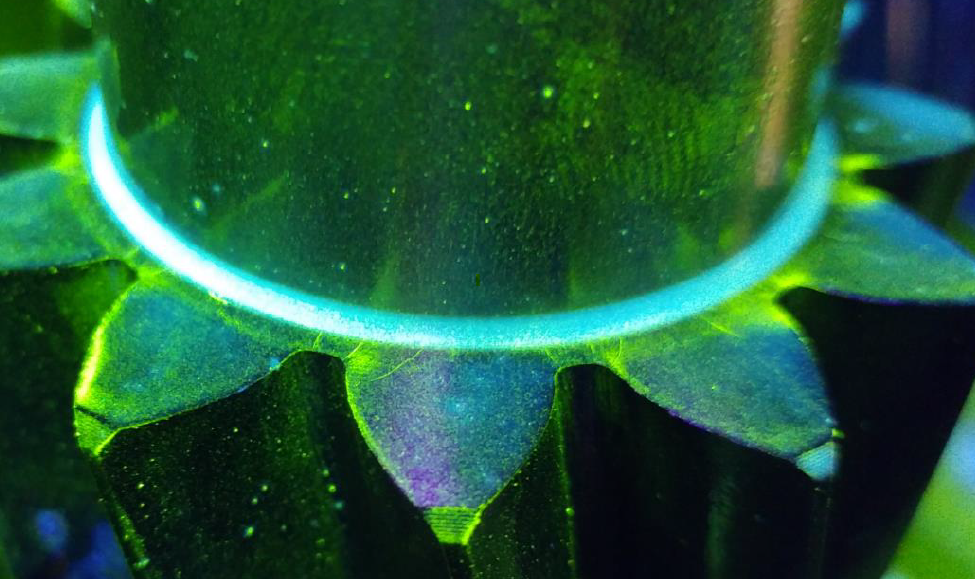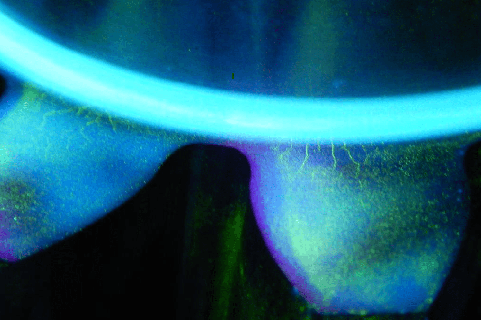 - Rilevazione dei difetti: qualsiasi discontinuità (come crepe, cricche, inclusioni, bruciature) altera il campo magnetico, causando un accumulo delle particelle fluorescenti in quella zona.